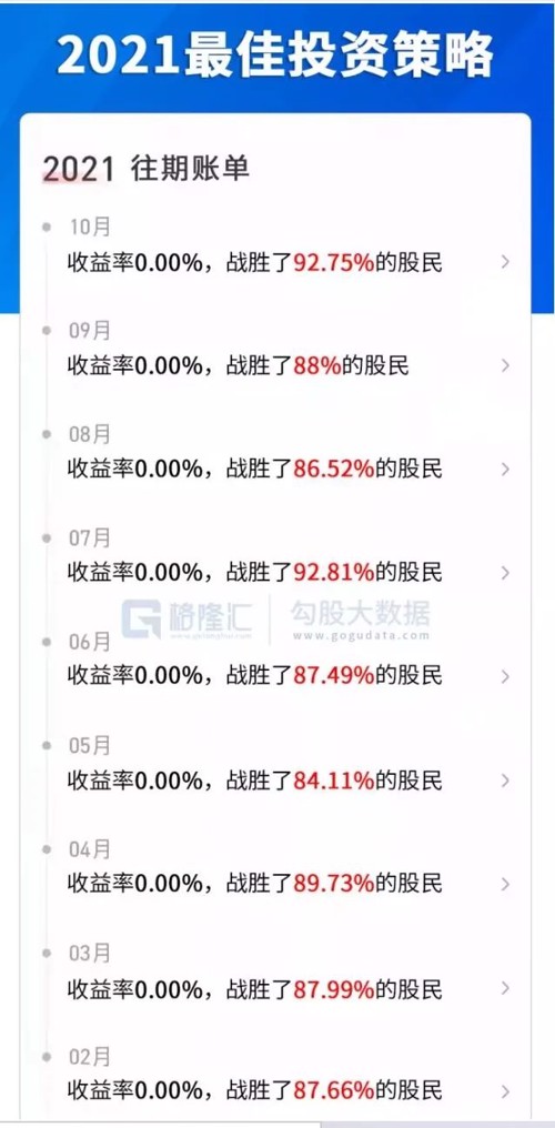 2021年即将过去,极度结构化的行情,让股民们盈少亏多。公号“格隆”和勾股大数据最近做了一个统计,结果让人啼笑皆非:每个月份如果空仓的话,将战胜绝大多数的股民。