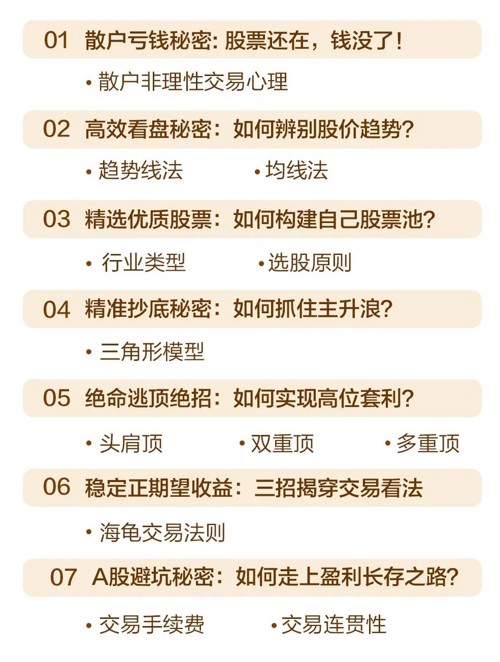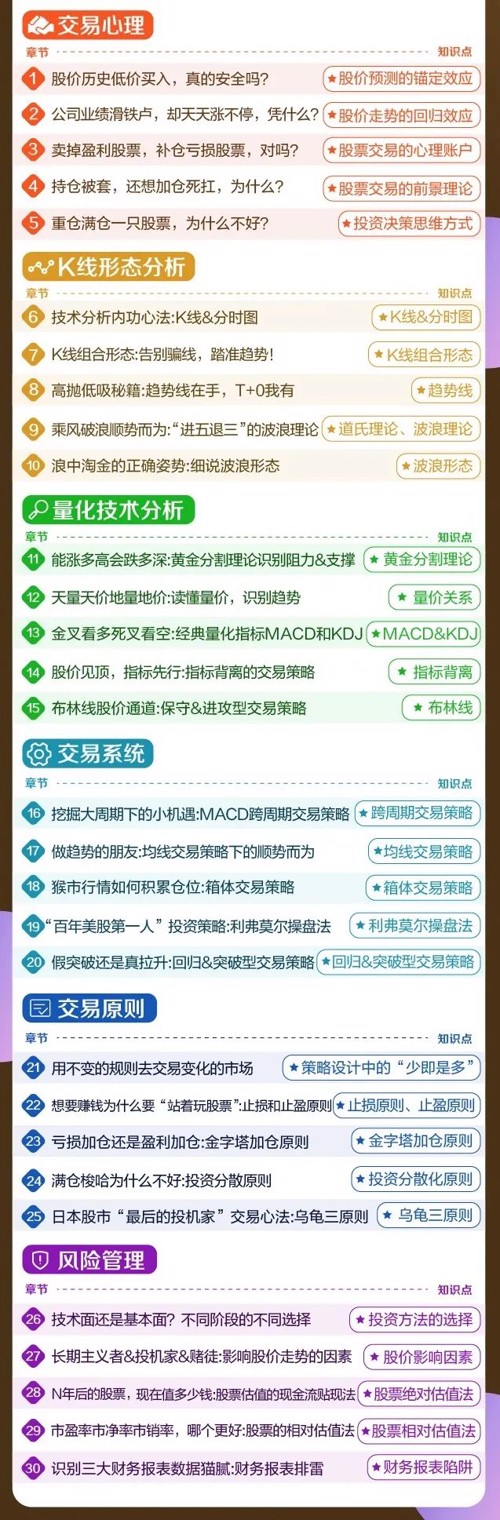 本书热身课部分,7天训练营课程教股民选对股票、识别股价趋势等,必修课部分从交易心理、K线形态分析、量化技术分析、交易策略、交易原则、风险管理六个板块展开,从买卖出发,利用丰富案例进行实用指导,讲解细致透彻,通过学习建立个人的投资框架和方法论,最终实现盈利。