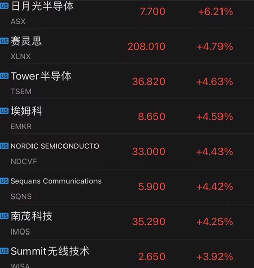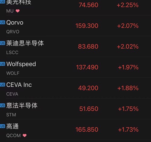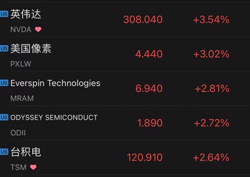 赛灵思涨近5%,英伟达涨超3%,台积电涨近3%,美光涨超2%,高通涨近2%。