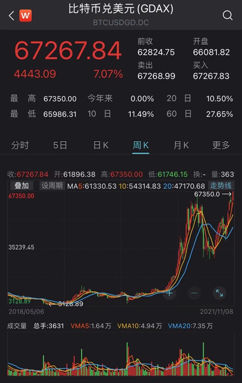 Wind数据显示,比特币兑美元价格一度达到67350美元/枚,创下新高。而Bitstamp平台报价显示,比特币价格一度触及67763美元/枚。