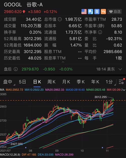 大型科技股也普涨,谷歌也创下历史新高。盘中,其市值更是一度突破2万亿美元,成为美股历史上第三家市值超过2万亿美元的公司。