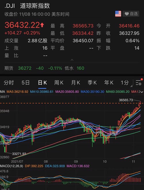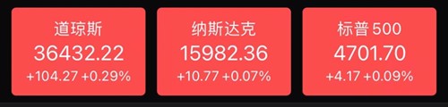 截至收盘,道指创盘中及收盘新高,纳指和标普500指数创收盘新高,但未创下盘中新高;道琼斯指数涨0.29%,报36,432.22点;标普500指数涨0.09%,报4,701.70点;纳斯达克指数涨0.07%,报15,982.40点。