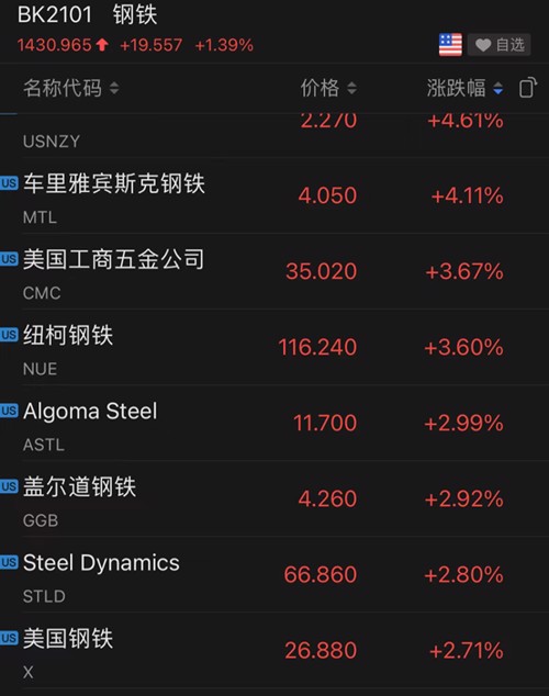 钢铁概念股方面,纽柯钢铁涨近4%,美国钢铁涨近3%。