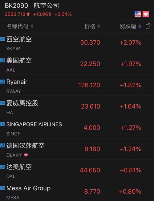 周一,在美国取消33国旅行禁令消息的影响下,航空股也普涨。