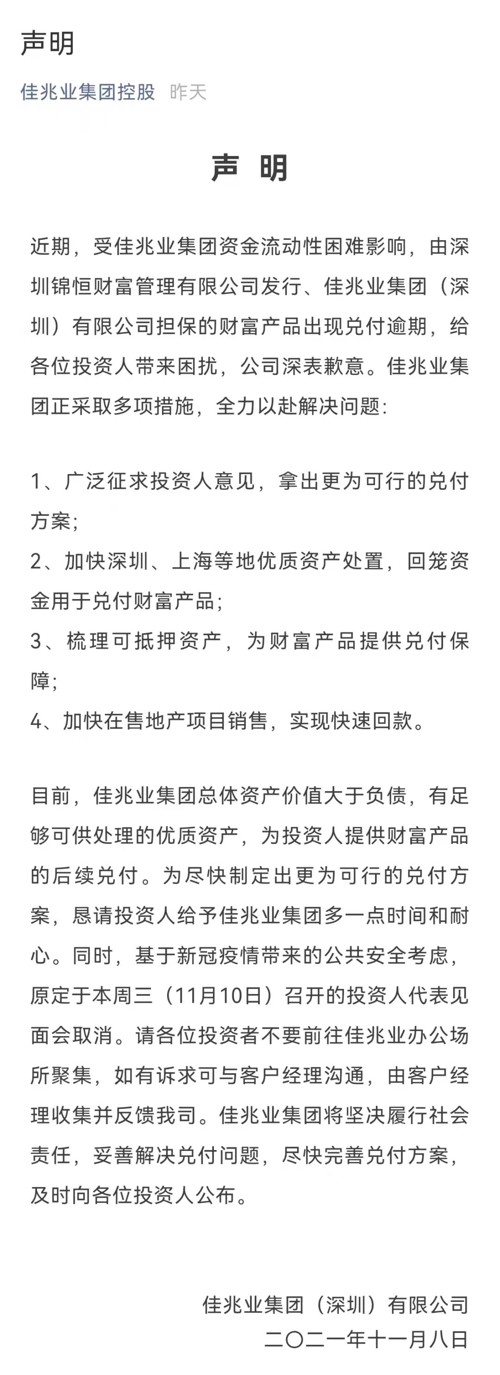 目前,佳兆业集团总体资产价值大于负债,有足够可供处理的优质资产,为投资人提供财富产品的后续兑付。为尽快制定出更为可行的兑付方案,恳请投资人给予佳兆业集团多一点时间和耐心。同时,基于新冠疫情带来的公共安全考虑,原定于本周三(11月10日)召开的投资人代表见面会取消。请各位投资者不要前往佳兆业办公场所聚集,如有诉求可与客户经理沟通,由客户经理收集并反馈我司。佳兆业集团将坚决履行社会责任,妥善解决兑付问题,尽快完善兑付方案,及时向各位投资人公布。