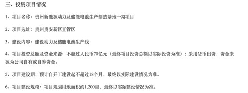此外,宁德时代11月5日公告称,公司拟在贵州省贵安新区投资建设贵州新能源动力及储能电池生产制造基地一期项目,项目总投资不超过人民币70亿元。