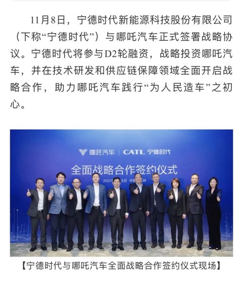 11月8日晚,哪吒汽车微信公众号发布消息称,宁德时代将参与D2轮融资,战略投资哪吒汽车,并在技术研发和供应链保障领域开启战略合作。