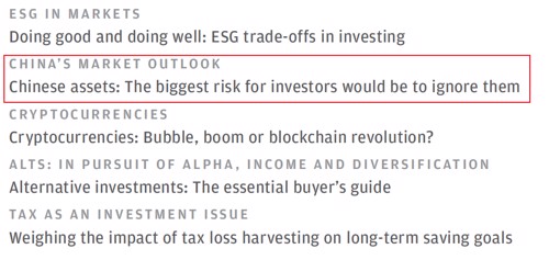 这份报告将中国资产单列为5大主题之一,与ESG投资、虚拟货币、另类资产、税收问题并列,并指出,最大的投资风险就是忽略中国资产的投资价值。