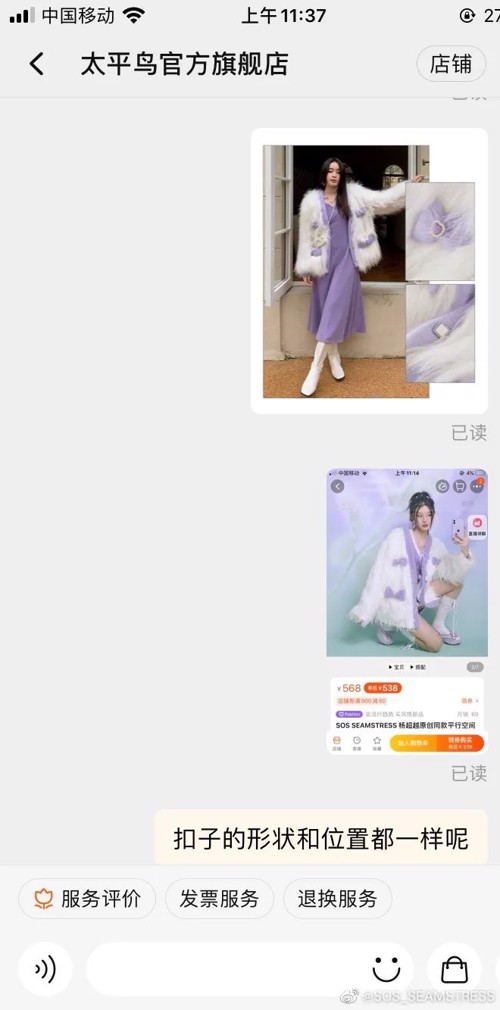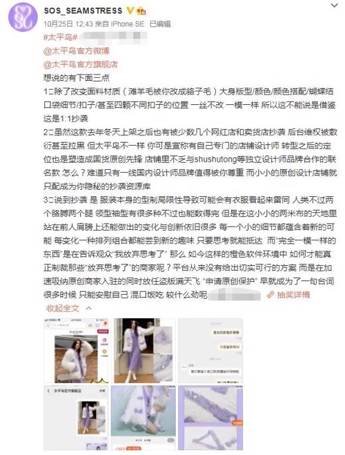 10月25日,微博博主SOS_SEAMSTRESS发布微博称,旗下一款服饰产品被太平鸟1:1复制。