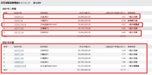 wind数据显示,截至三季度末,民生加银添鑫纯债前五大重仓债券占资产比例为35.25%,其中有3只重仓债为地产债,分别为20宝龙02、20华远地产MTN001、20时代09。