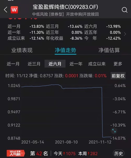 从净值走势看,宝盈盈辉纯债C疑似发生了巨额赎回,引发净值直线大跌。