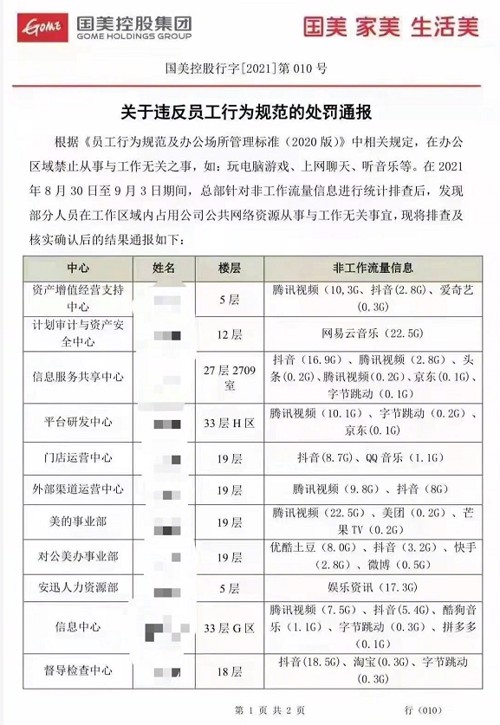 网传资料显示,国美在2021年8月30日至9月3日期间对在上班时间看视频、听音乐、刷新闻的员工进行了通报处罚。