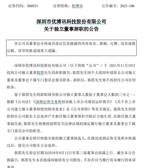 优博讯称,郭雳因个人原因申请辞去公司独立董事及董事会下属专门委员会委员职务。