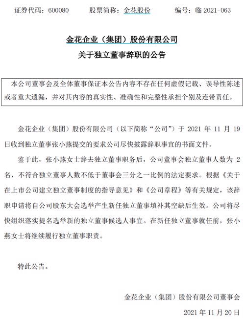 金花股份公告称,收到独立董事张小燕提交的要求公司尽快披露辞职事宜的书面文件。