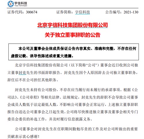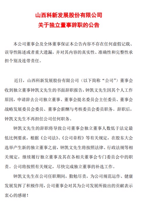 科新发展称,收到独立董事钟凯文的书面辞职报告,钟凯文因其个人工作原因,申请辞职。