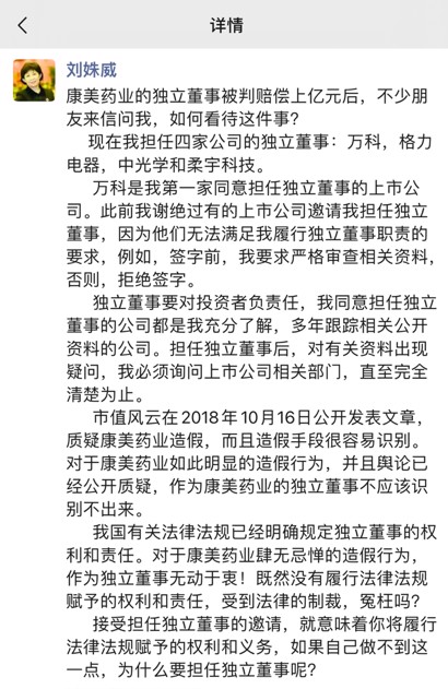 11月18日晚间约11点时,身兼4家公司独立董事的刘姝威在朋友圈发布近500字的感慨。