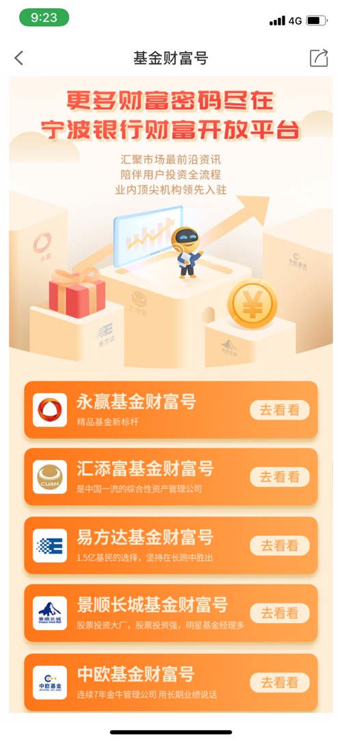 目前,包括易方达、汇添富、中欧在内的8家基金公司已率先入驻宁波银行财富开放平台,其他合作机构后续也将陆续加入。