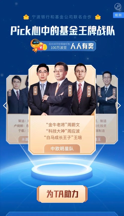目前,宁波银行已联动易方达、汇添富、中欧、景顺与永赢5家头部基金公司,在宁波银行APP中同步推出了“Pick基金王牌战队”的主题活动,客户关注各家基金公司的财富号,学习投教内容,即可获得现金红包等激励。