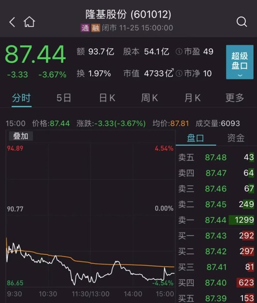 截至11月25日午盘,隆基股份股价暂报87.44元/股,下跌1.97%。最新市值4733亿元。