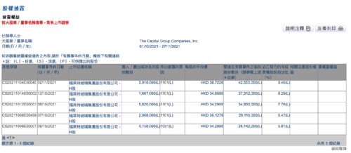 10月6日,资本集团买入415.8万股,平均价格34.30港元;10月7日资本集团再度出手,买入296.8万股,平均价格35.13港元;10月8日,资本集团第三次出手,买入582万股,平均价格34.09港元;10月12日,资本集团第四次出手,买入166.7万股,平均价格34.89港元;11月2日,资本集团第五次出手,买入391.8万股,平均价格38.72万股。