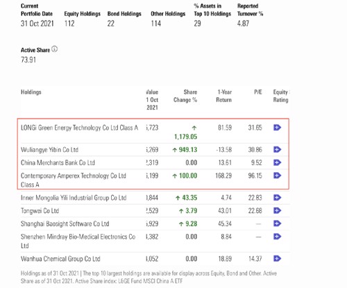 同期,JPMorgan基金-中国A股机会基金I(acc)港元加仓五粮液949.13%,加仓宁德时代100%。加仓之后,截至10月底,隆基股份跃升为“JPMorgan基金-中国A股机会基金I(acc)港元”的第一大重仓股,五粮液位居第二。JPMorgan基金-中国A股机会基金I(acc)港元为摩根大通旗下旗舰A股基金,最新规模超过500亿元人人民币。