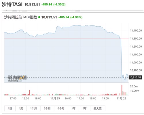 周日午后,沙特基准股指开盘大跌超5%,截至记者发稿,仍跌超4%。