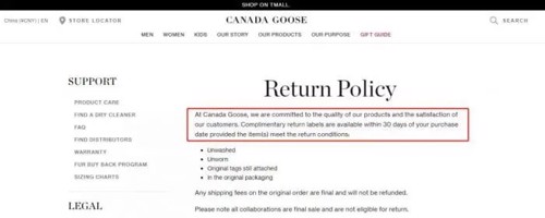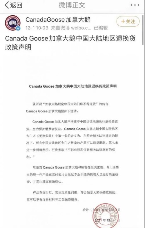 近日,加拿大鹅退换货条款的公平性和合理性受到了社会的广泛关注。(此前报道:11400元买的羽绒服,商标绣错、缝线粗糙…加拿大鹅却说中国大陆门店不得退货?)