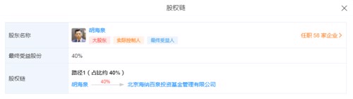 股权信息显示,胡海泉持股比例为40%, 是该公司最大股东和疑似实际控制人。