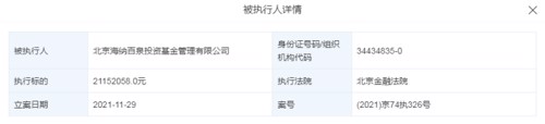 天眼查显示,11月29日,北京海纳百泉投资基金管理有限公司新增一则被执行人信息,执行标的为2115.2058万元,执行法院为北京金融法院。