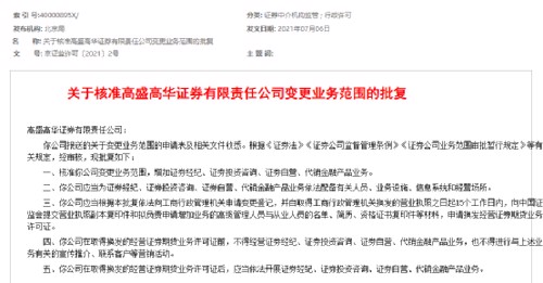 高盛高华业务范围变更获批。今年7月6日,北京证监局正式核准高盛高华证券有限责任公司变更业务范围,核准高盛高华增加证券经纪、证券投资咨询、证券自营、代销金融产品业务,并且需要依法配备有关人员、业务设施、信息系统和经营场所。