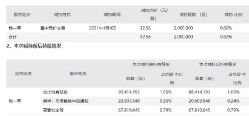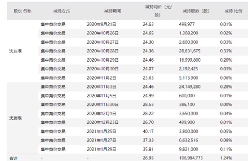 据公告,2020年9月21日至2021年1月29日间,沈友根以集中竞价方式进行了15次减持,减持均价在23.63元/股~40.17元/股,持股股份数量从38.6万股到2863万股不等。