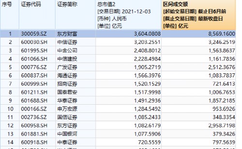 截至12月3日收盘,券商板块共有13只总市值过千亿的个股,东方财富总市值排在第一位,与第二名中信证券拉开400亿市值的距离,从近半年的股价表现来看,东方财富区间成交额8569.16亿元, 同样遥遥领先。