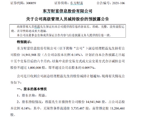 东方财富12月3日晚间发布公告称,公司副总经理程磊先生持有公司股份约1494万股(占公司总股本比例为0.14%),计划在自本公告披露之日起十五个交易日后的六个月内,以集中竞价交易方式或大宗交易方式合计减持公司股份不超过100万股,即不超过公司总股本的0.0097%。