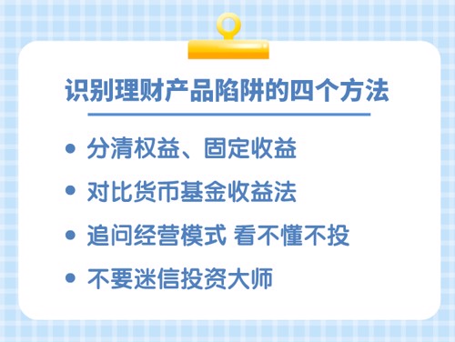 首选明确一点,看不懂的不要投,一些理财产品结构非常复杂,就算是很多专业投资人也被绕晕,对于投资者来说,必须回到常识,回到商业模式本身,若其中存在明显的疑点,那就谨慎一点为上。一门生意,如果根据你的常识判断,大概率很难赚钱,那还是不要投资为妙。