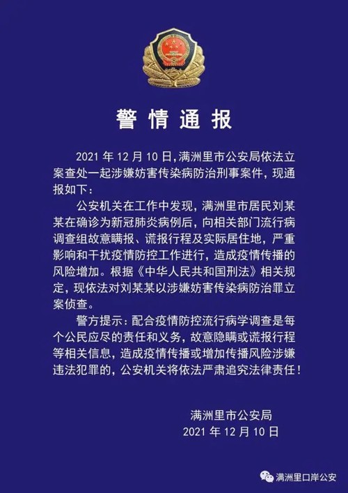 2021年12月10日,满洲里市公安局依法立案查处一起涉嫌妨害传染病防治刑事案件,现通报如下:
