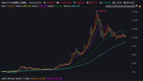 截止12月13日,Wind磷化工指数收于1810.07点,今年上涨121.92%,位居概念板块涨幅前列,远大于上证5.99%的涨幅。
