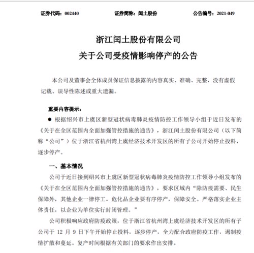 12月13日晚间,闰土股份发布公告称,公司积极响应政府防疫政策,位于浙江省杭州湾上虞经济技术开发区的所有子公司于12月9日下午开始停止投料,逐步停产,全力配合政府防疫工作,遏制疫情扩散和蔓延。复产时间根据有关部门的要求作出安排。