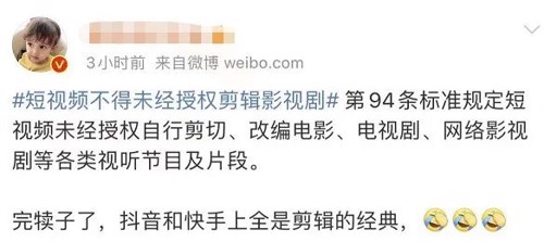 证券时报此前报道称,目前抖音、快手均规定,直播影视剧、节目需要先取得相应的版权,在没有版权的情况下播放属于违规操作。但对于影视剧剪辑传播行为,两大平台的规则要模糊很多。