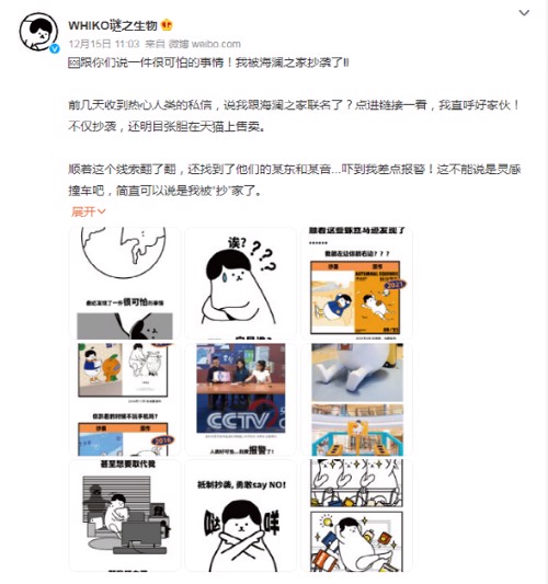 12月15日,WHIKO谜之生物官方发布微博表示,被海澜之家抄袭了。