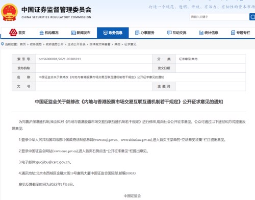 12月17日,证监会发布关于就修改《内地与香港股票市场交易互联互通机制若干规定》公开征求意见的通知。