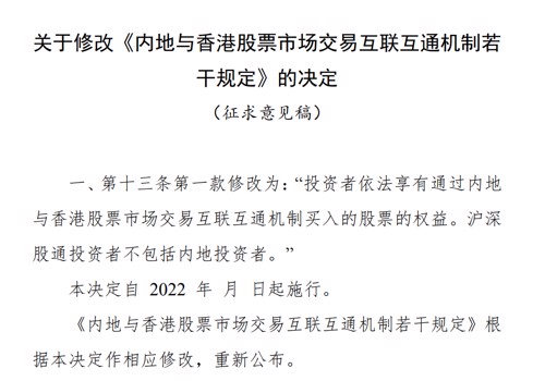 修订内容显示,本次将《规定》第十三条第一款修订为,“投资者依法享有通过内地与香港股票市场交易互联互通机制买入的股票的权益。沪深股通投资者不包括内地投资者。”