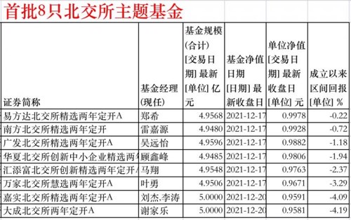Wind统计显示,截至12月20日,11月23日成立的首批获8只北交所主题基金即将“满月”前,净值已下跌至1元以下,成立以来出现不同程度的浮亏。