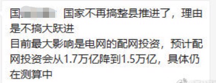 业内有传闻称,某分析师称:“国家不再搞整县推进了,理由是不搞大跃进,目前最大影响是电网的配网投资,预计配网投资会从1.7万亿降到1.5万亿,具体仍在测算中”。