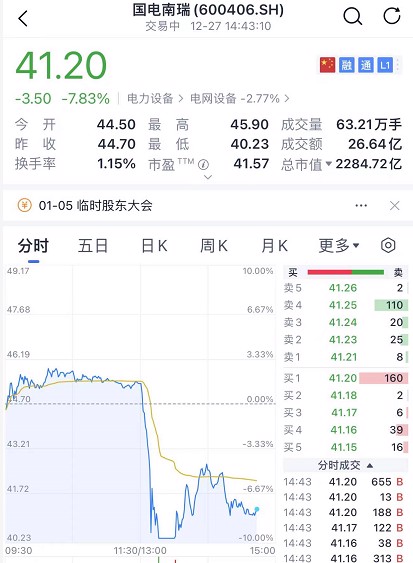 智能电网权重股国电南瑞午后开盘直线跳水,股价一度接近跌停,目前跌超8%。