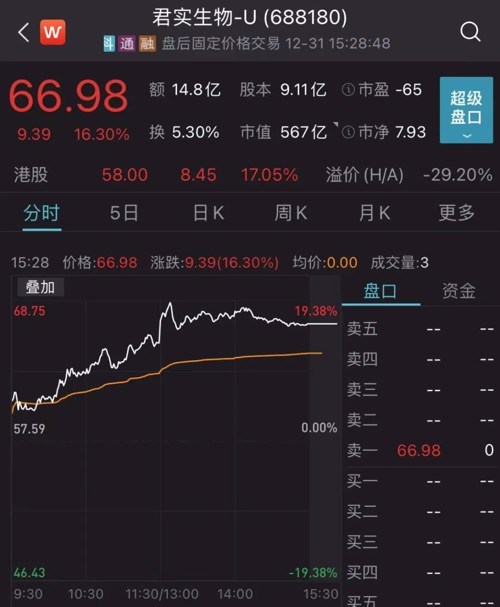 此外,受此利好消息影响,截至31日收盘,A股君实生物涨超16%,港服君实生物涨逾17%。