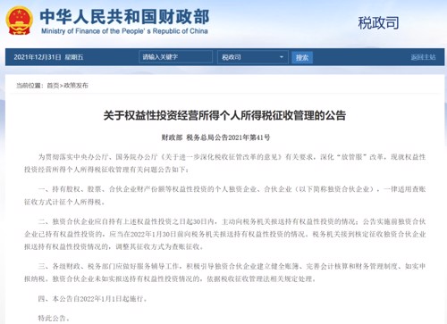 12月31日,财政部、税务总局发布《关于权益性投资经营所得个人所得税征收管理的公告》称,自2022年1月1日起,持有股权、股票、合伙企业财产份额等权益性投资的个人独资企业、合伙企业(以下简称独资合伙企业),一律适用查账征收方式计征个人所得税。