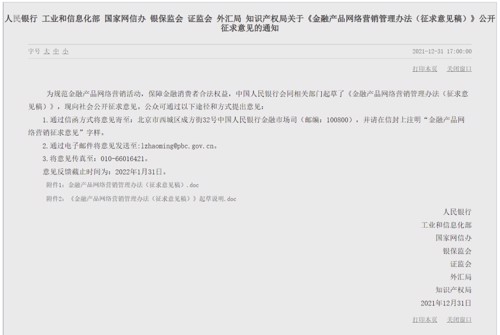 12月31日,中国人民银行等7部门就《金融产品网络营销管理办法(征求意见稿)》公开征求意见。《征求意见稿》要求,通过直播、自媒体账号、互联网群组等新型网络渠道营销金融产品,营销人员应当为金融机构从业人员并具备相关金融从业资质。