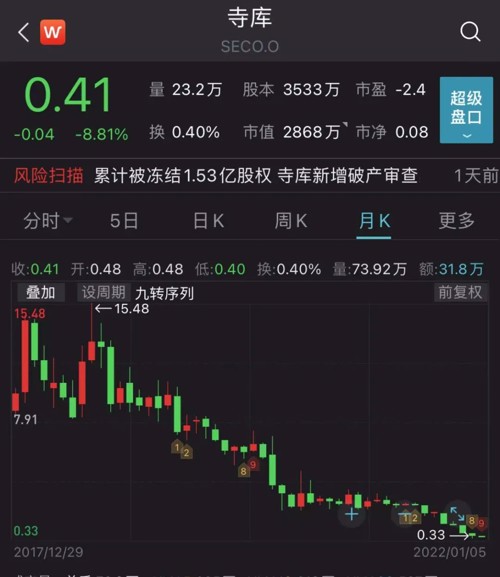 截至1月5号美股收盘,寺库股价报0.406美元,当日大跌8.81%,最新股价相较发行开盘价12.1美元/股已经跌去97%。