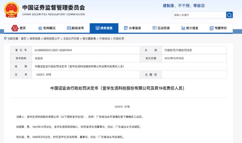 目前,宜华集团的情况估计也是“一团糟”。去年10月,中国证监会下发了对宜华生活的《行政处罚决定书》以及《市场禁入决定书》,令其责令改正,给予警告,并处以600万元的罚款。另外,包括宜华生活实际控制人刘绍喜在内的19位董监高给予警告、罚款,全案违法主体合计罚款3885万元。