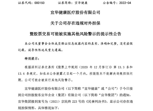 1月7日晚间,宜华健康发布公告称,公司存在违规担保情形,涉及公司可能承担的债务本金约为4255万元,公司股票交易可能被实施其他风险警示。